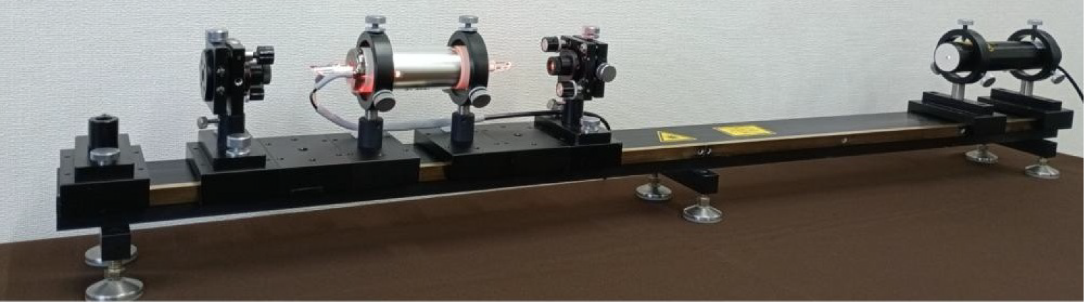 | 構成品 | He-Neレーザチューブ(波長:633nm,出力:50μW以上(透過率付きミラーを使用した場合1mW以上)) 共振器用レーザミラー(調整機能付)、ガイド光(He-Neレーザ)、光学レール、ホルダー、レーザ電源 |